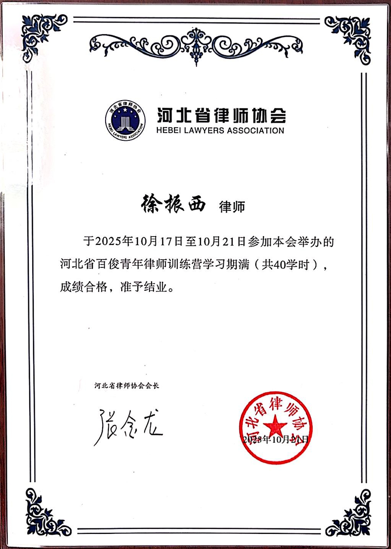 10月17日至10月21日,河北省“青马工程”青年法律工作者培训班暨“百俊”青年律师训练营第八期在邯郸圆满举办。此次培训班由共青团河北省委员会、河北省律师协会联合主办,河北省青年法律工作者协会、河北省律师协会青年律师工作委员会、河北司法警官职业学院、共青团邯郸市委员会、邯郸市律师协会共同承办。培训旨在全面提升青年律师的政治思想、执业素养和业务水平等综合素质,引导广大青年律师努力成为党和人民满意的好律师。来自全省的90余名青年律师,以及来自重庆、内蒙古的青年律师代表参与了此次活动。我所徐振西律师参加此次培训班并顺利结业。