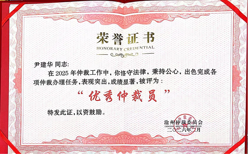 2026年3月10日,沧州仲裁委员会2025年度优秀仲裁员、仲裁调解机构表彰大会暨新修订《仲裁法》培训会议顺利召开,对年度履职突出、成绩优异的仲裁员进行隆重表彰。沧州市律师协会会长、河北东方伟业律师事务所主任尹建华凭借深厚的法律功底、严谨的办案作风、公正高效的仲裁履职表现,荣获“优秀仲裁员”荣誉称号。